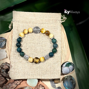 Together, Golden Tiger's Eye, Yellow Tiger's Eye, and Green Moss Agate form a powerful trio, inviting you to embrace your inner strength and awaken to the magic within. Wear this unique bracelet as a symbol of confidence and vitality, knowing that you are supported by the unwavering energies of these magnificent gemstones.